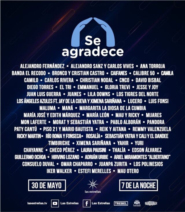 SE AGRADECE contará con la participación especial de artistas entre los que destacan; J Balvin, Maluma, Rosalía, Ricky Martin, Laura Pausini, Thalía, Chayanne, Lucero, Los Tigres del Norte, Timbiriche, Pablo Alborán, Gloria Trevi, Yuri, Mon Laferte, Maná y Carlos Rivera.
