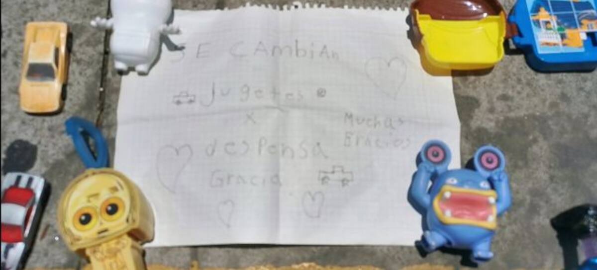 El pequeño se instaló en la colonia Roma en la calle frontera, frente al Metrobús, el menor con su cubrebocas negro colocó en el suelo parte de sus juguetes que ofrece con un letrero que dice: "Se cambian juguetes por despensa. Muchas gracias".