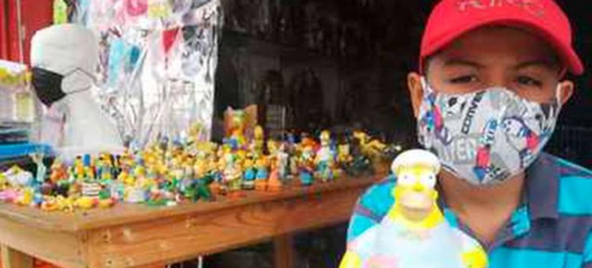 El niño que no supera los 12 años, se sienta afuera del local de su padre donde venden caretas. Con una mesa de madera y decenas de juguetes de la famosa serie animada, el pequeño ofrece sus figuras de colección; el más barato a 15 pesos y el más caro a 70.