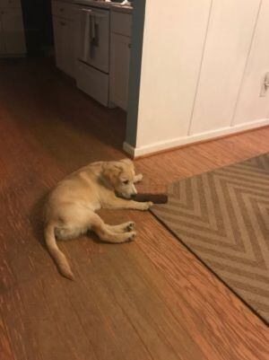 Para la familia fue bastante curioso que un ladrillo se convirtiera en su distracción favorita. El flechazo surgió repentinamente cuando colocaron el ladrillo en la alfombra para que el extremo no se enroscara y desde ese momento Sunny no pudo resistirse. Juego con él cada que tiene oportunidad y lo arrastra por toda la casa.