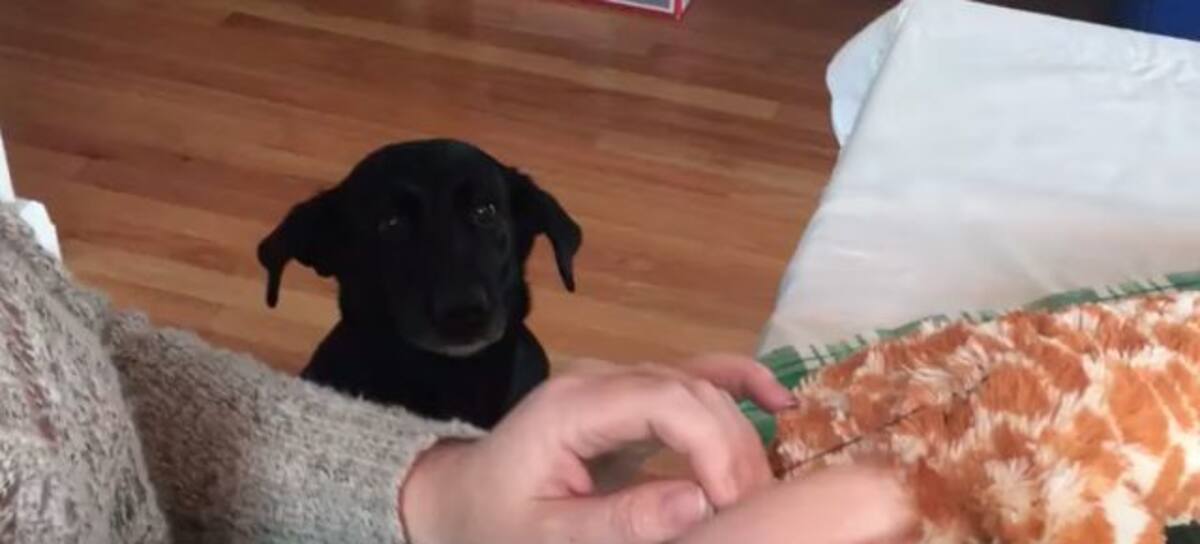 Perrito observa muy nervioso a su dueña mientras esta arregla su peluche