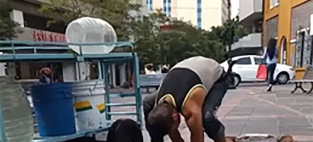 En el video de apenas un minuto de duración se observa como el hombre que es vendedor en La Plaza de San Francisco en El Centro Histórico de Guadalajara, llega sus garrafones de agua extrayendo la misma de una coladera que se encuentra en la misma plaza.