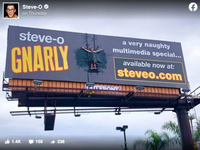 Steve O exmiembro de "Jackass" no ha dejado la locura. Recientemente apareció pegado a un espectacular con fin de publicitara su nuevo especial de comedia.