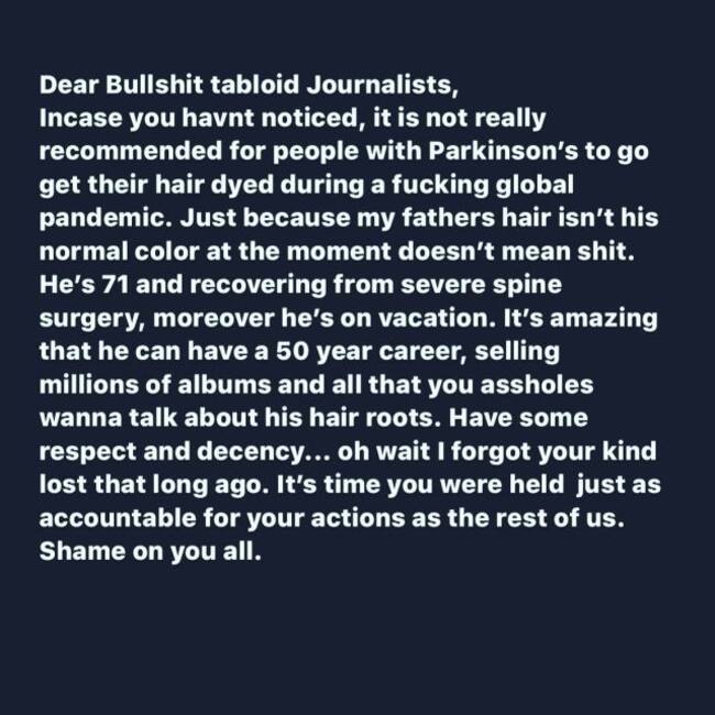 “Estimados periodistas sensacionalistas de mi$%da: En caso de que no lo hayan notado, no es para nada recomendable que las personas con párkinson se tiñan el pelo durante una jodida pandemia mundial. El hecho de que el pelo de mi padre no tenga su color normal en este momento no significa un carajo. Tiene 71 años y se está recuperando de una cirugía de columna severa, además está de vacaciones. Es asombroso que pueda tener una carrera de 50 años, vendiendo millones de álbumes y todo lo que ustedes idiotas puedan comentar son sus raíces de cabello. Tengan algo de respeto y decencia… Oh, espera me olvidé que los de su clase perdieron esto hace mucho tiempo. Es hora de que se hagan tan responsables de sus actos como al resto de nosotros. Qué vergüenza me dan”.