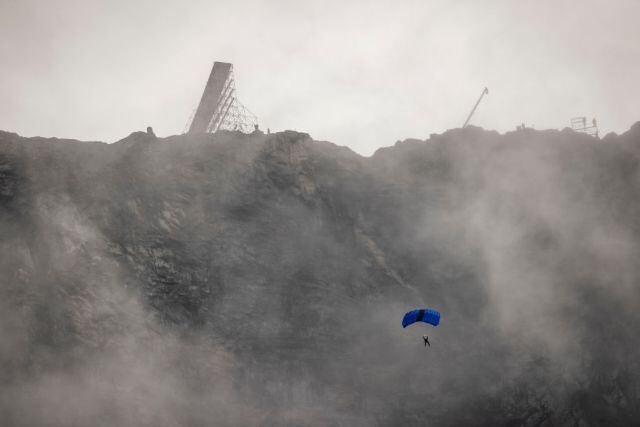 En un riel parecido al de una montaña rusa, en las montañas de Helsetkopen en el municipio de Stranda, Noruega, Tom Cruise manejaba a exceso de velocidad en su moto para de repente saltar, soltar la motocicleta y abrir un paracaídas que lo pondría a salvo de un salto de varios metros de altura.