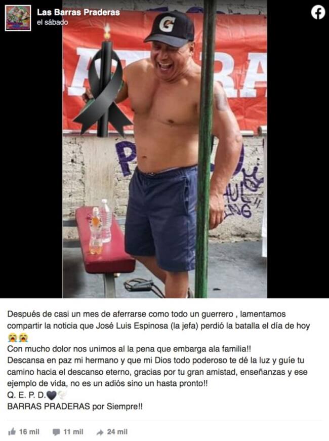 "Después de casi un mes de aferrarse como todo un guerrero lamentamos compartir la noticia que José Luis Espinosa (la jefa) perdió la batalla el día de hoy", se lee en el mensaje.