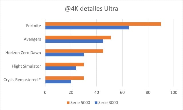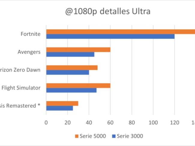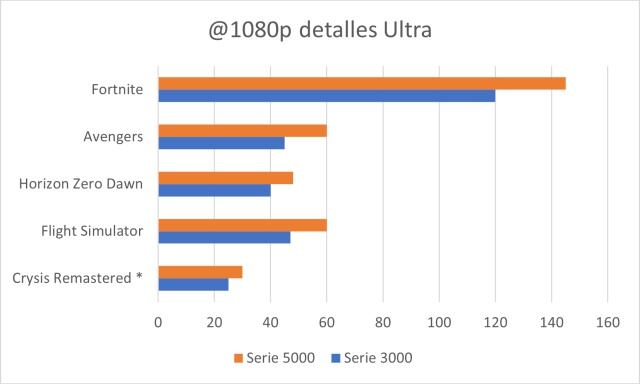 1080: la serie 3000 se desempeñaba sin problemas en este rubro manteniendo más de 30 cuadros por segundo en los juegos más demandantes. Sin embargo, la serie 5000 claramente le lleva ventaja y de forma evidente. Juegos como Fortnite no son ningún problema para el procesador.