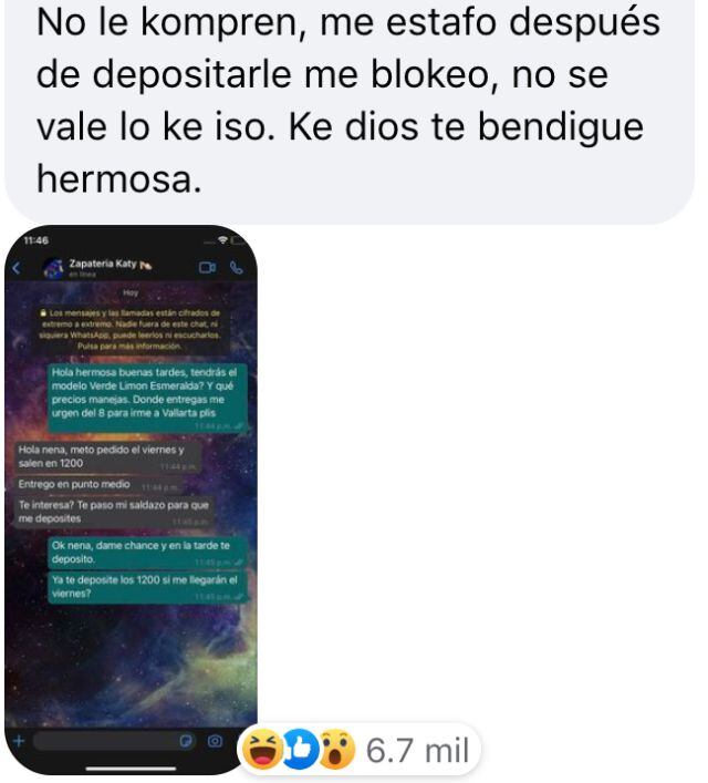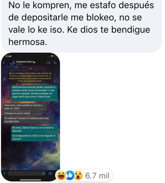 "Nena ya te hice el depósito en el oxxo y no me contestas el whats, me urgen, son para mi suegra", "Neni, ¿dónde entregas? ¿Me podrías decir de qué número son?", "No le compren, me estafó, después de depositarle me bloqueó, no se vale lo que hizo. Que dios te bendiga hermosa", "Yo compré el modelo Ojo de Agua y Limón sin semilla, al usarlos están súper incómodos, se me raspa el juanete y no son iguales como en la foto. La verdad no valen la pena para el precio que los vende ella. No me quiso devolver mi dinero, son imitación", dicen algunos comentarios con cientos de reacciones.