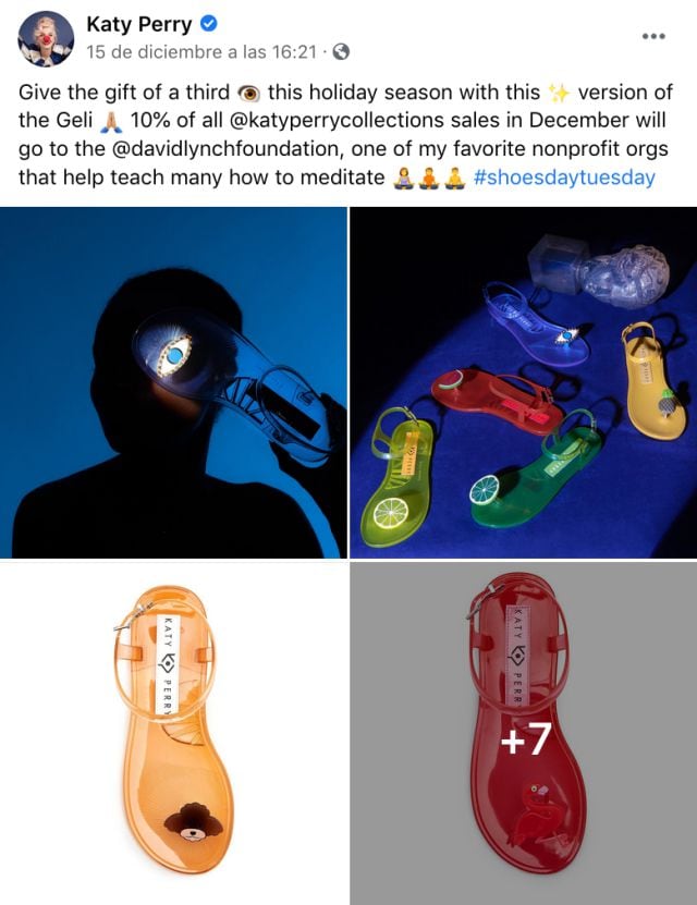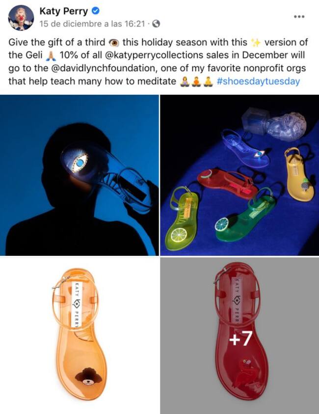 Fue en la plataforma de Facebook donde Katy Perry publicó unos modelos de sandalias que lanzará al mercado. Con un diseño que nos recuerda a la moda de los 2000 (o a las ventas informales por internet), Katy Perry anunciaba que de todo lo recaudado, el 10% iría a una fundación especial.