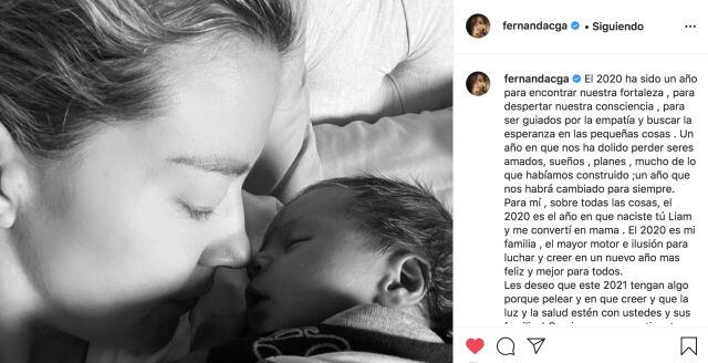 "Para mí , sobre todas las cosas, el 2020 es el año en que naciste tú Liam y me convertí en mama . El 2020 es mi familia , el mayor motor e ilusión para luchar y creer en un nuevo año mas feliz y mejor para todos", escribió la actriz para darle la bienvenida al 2021, esperando encontrar fortaleza en estos momentos tan difíciles.