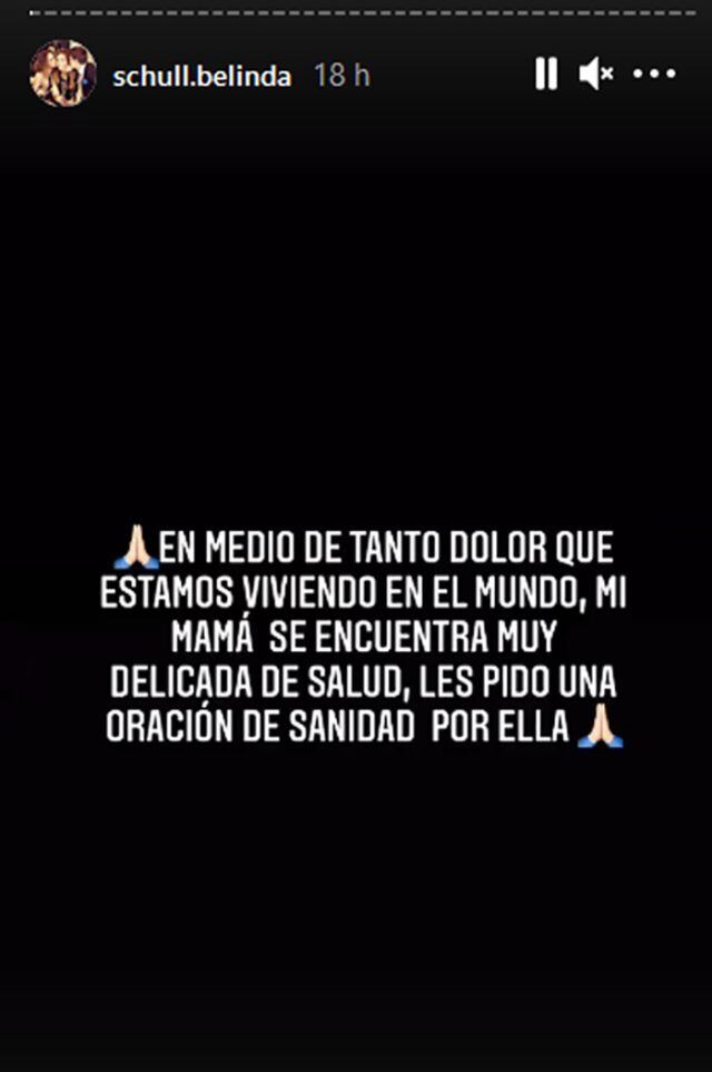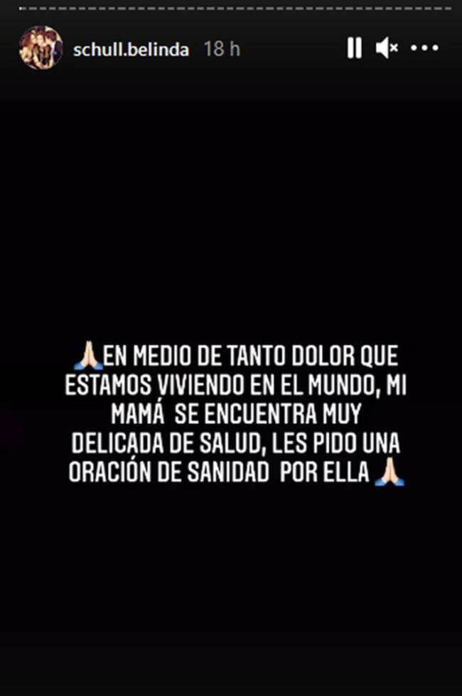 “En medio de tanto dolor que estamos viviendo en el mundo, mi mamá se encuentra muy delicada de salud. Les pido una oración de sanidad por ella”, escribió Schüll en sus historias Instagram.