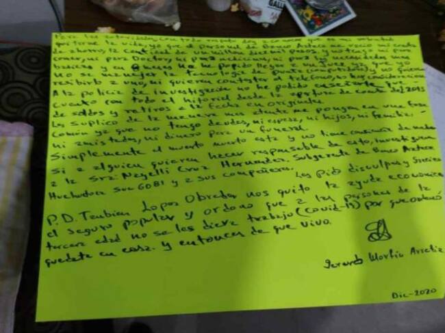Lo que llamó la atención de los servicios de emergencia fue que a su lado encontraron una cartulina amarillo fosforescente, en la cual, escribió un mensaje antes de suicidarse.
