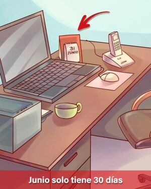 En la fotografía observamos un escritorio antiguo lleno de libros, folios, plumas y un teléfono entre otras cosas, pero algo anda mal. ¿Ya averiguaste qué es?. Se trata de la fecha en el calendario. Has tus cuentas, pues resulta que junio solamente tiene 30 días. Divertido, ¿no?.