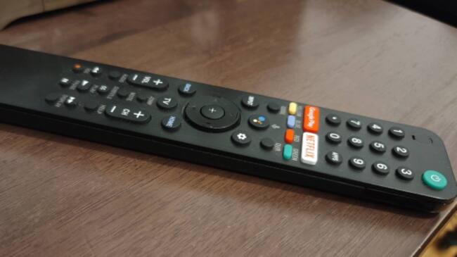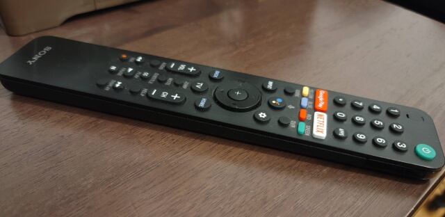 El control remoto es grande. Una extraña tendencia de algunos fabricantes es la de crear controles remotos que parecen una regla de 30 cm. Incluye micrófono para los asistentes digitales y botones de atajo para aplicaciones. Es extraño que dichos botones no incluyan YouTube. Otro detalle es que el control no se apunta como otros. Debes tenerlo de forma vertical para que la pantalla registre su infrarrojo.