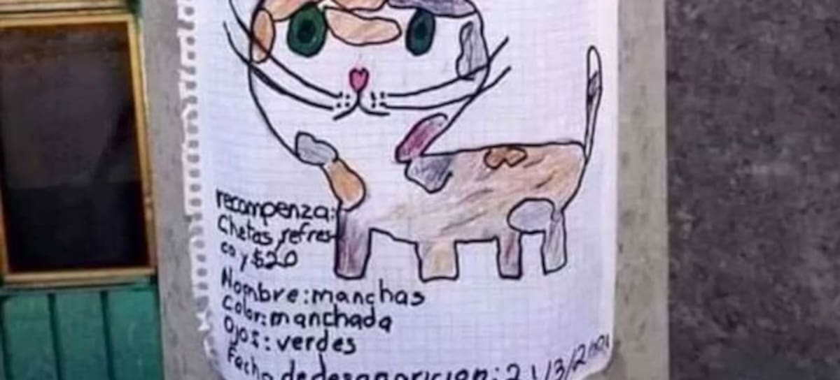 En redes sociales circula la fotografía de un cartel de "se busca". En él, podemos ver el dibujo de un gatito con ojos verdes y manchas cafés y grises. Se trata de "Manchas", la mascota de un niño del municipio de Mixquiahuala, en Hidalgo.