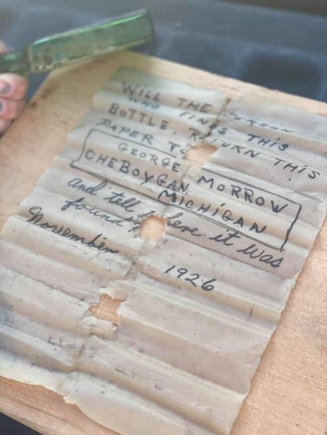 La botella, que se había llenado de agua en dos terceras partes, tenía en su interior la nota manuscrita con el mensaje fechado en noviembre de 1926, hace 95 años, y llevaba escrito: "¿La persona que encuentre esta botella devolverá este papel a George Morrow Cheboygan, de Michigan, y dirá dónde se encontró?".
