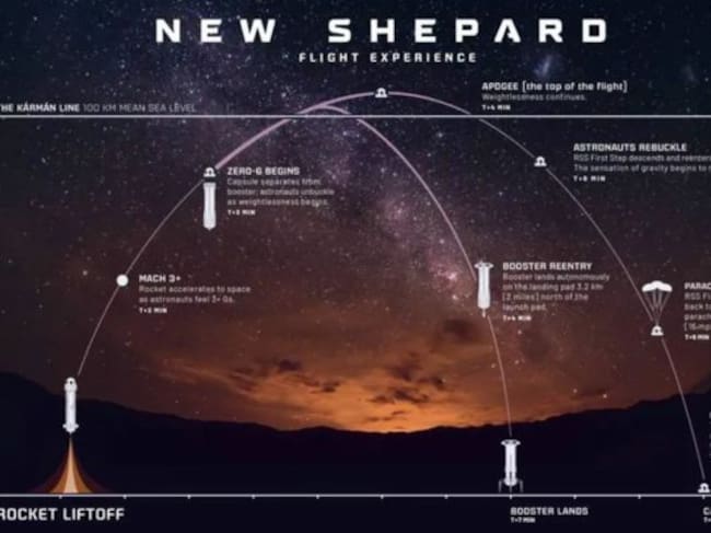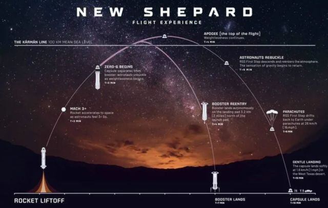 De acuerdo con los detalles de lo que tendría suceder durante el viaje, el New Shepard se tenía que desprender suavemente de la plataforma para iniciar el conteo de lanzamiento, y una vez que traspasara los 100 kilómetros, la cápsula se separaría del cohete impulsor, quedando así unos minutos de microgravedad, lo cual permitiría a los pasajeros tener una óptica de la curvatura de la Tierra desde su límite exterior.