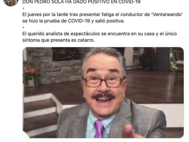 "El querido analista de espectáculos se encuentra en su casa y el único síntoma que presenta es catarro", dice el tweet de Álex Kaffie, el cual confirmó el estado de salud de Pedrito Sola.
