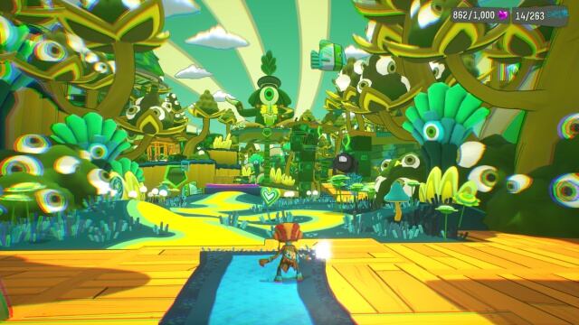 La temática cerebral no sólo se siente en la trama, sino también en su enfoque al género de los juegos de plataformas. En vez de ponernos intrincadísimas trampas y pruebas de reflejos, Psychonauts 2 nos obliga a usar el cerebro en cada situación. Raz puede utilizar una gran variedad de movimientos psíquicos para pasar los niveles y atacar a sus enemigos. Dichos poderes van desde la telequinesis, que nos permite recoger objetos de gran tamaño o fuera de nuestro alcance; hasta la levitación y la piromancia. Cada nivel está diseñado para usar la mayor cantidad de habilidades de forma inteligente para poder sortear cada acertijo que se pone en nuestro camino. El combate implica algunos golpes por parte de Raz, pero la mayoría del tiempo estarás usando tu habilidad psíquica para mantener a tus oponentes a raya. Aunque puedes coleccionar un montón de objetos como en otros juegos del género, la mayoría son totalmente opcionales y el pasar de cada nivel no depende de que los halles todos. Cada mundo cerebral es único y presenta una multitud de escenarios únicos: un hospital-casino, un festival de música psicodélica y hasta un reality show de cocina con marionetas. La variedad de los niveles lo mantiene fresco en cada jugada. Quizá la única queja que tenemos acerca de ellos es que muchos incluyen pequeñas secuencias sin mucho qué hacer, dándole una longitud que siente falsa. Muchos de ellos podrían omitir ciertos subniveles que no agregan demasiado. Afortunadamente para los “completistas “, al final del juego puedes regresar a cada nivel y recolectar todos los ítems que te hayas perdido en la primera pasada.