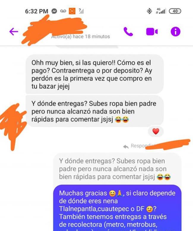 Tania Bazarcito, como se hace llamar la vendedora en Facebook, compartió la conversación que tuvo con una clienta que estaba interesada en sus prendas. Al inicio parecía una venta normal, Tania le explicaba cómo funcionaba la compra y la entrega. Sin embargo todo cambió cuando la joven a quien decidió dejar en anonimato, le hizo una pregunta muy personal.