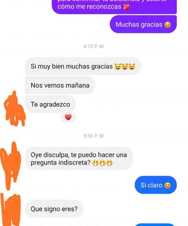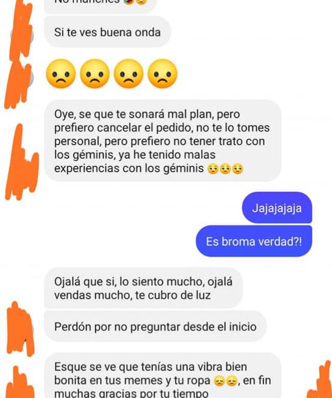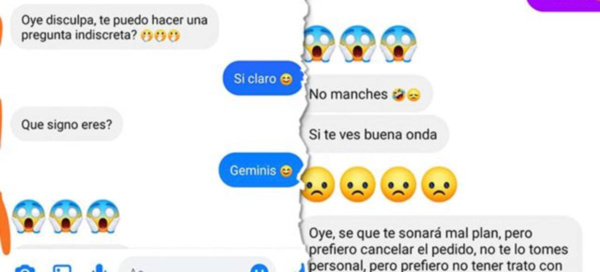 "No manches si te ves buena onda. Oye sé que te sonará mal plan pero prefiero cancelar el pedido. No te lo tomes personal pero prefiero no tener trato con los géminis, ya he tenido malas experiencias con los géminis", dijo supuestamente apenada.