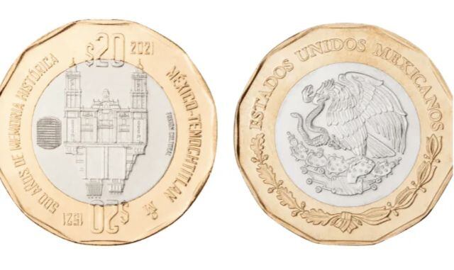 Esta moneda se ha convertido en la más buscada de las 3, pues posee una interesante composición: desde un ángulo se puede ver la Catedral de la Ciudad de México y desde otro se aprecia al Templo Mayor, como una especie de reflejo.