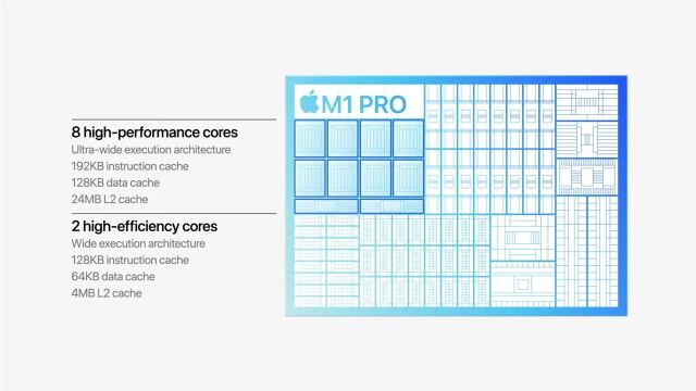Ahora habrá un nuevo lineal de Macs con el nuevo procesador M1 Pro creado con tecnología de 5 mm que promete tener un ancho de banda de hasta 200 GB/s a 256-bit con una interfaz LPDDR5, casi el triple que el M1. Este chip soportará hasta 32 GB de memoria unificada y tendrá 8 núcleos de alto rendimiento, 2 para alta eficiencia y 16 para gráficos con un poder de 5.2 teraflops. En el papel este SoC promete tener hasta un 70% mejor desempeño y hasta 2 veces mejor desempeño a nivel GPU que el modelo anterior.
