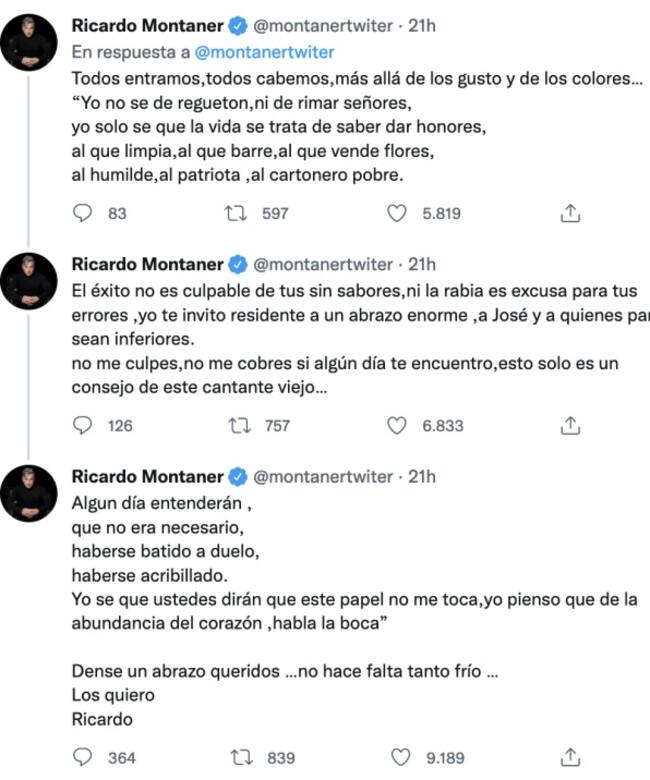 Como un artista con varios años de experiencia y fama, Ricardo Montaner se considera un hombre maduro que sabe que lo peor que se puede hacer en la industria, es tener problemas con los demás. De esta manera, decidió emitir un comunicado a través de Twitter, tratando de generar una reconciliación entre ambos cantantes del género urbano.