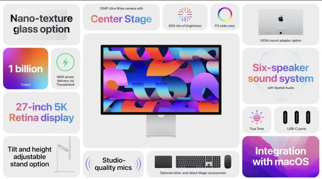 Esta pantalla Retina de 27” tendrá una resolución de 5K (5120 x 2880), brillo de 600 nits, tecnología True Tone, opción de vidrio nanotexturizado, una webcam de 12 megapixeles con gran angular, sistema de audio espacial con Dolby Atmos y tres micrófonos con calidad de estudio. En la parte trasera integrará tres puertos USB-C y uno Thunderbolt 3. Esta pantalla tendrá un precio que va desde los 39,999 pesos.