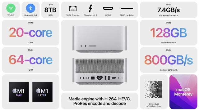 Una nueva Mac diseñada para trabajar a manera de escritorio y que podrás encontrar con procesadores M1 Max y M1 Ultra, incluirá 4 puertos USB-C Thunderbolt 4 en la parte trasera y dos en la parte delantera, también incluirá dos puertos USB-A y un puerto para tarjetas SDXC. Dependiendo de la versión podrá encontrarse en configuraciones de 64 GB o hasta 128 GB de memoria unificada. Este equipo va en precios que arrancan desde los $51,999 pesos.