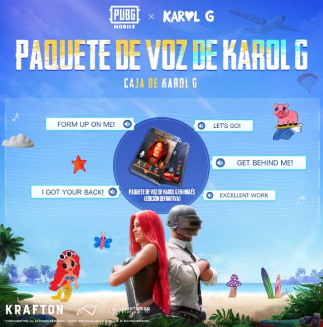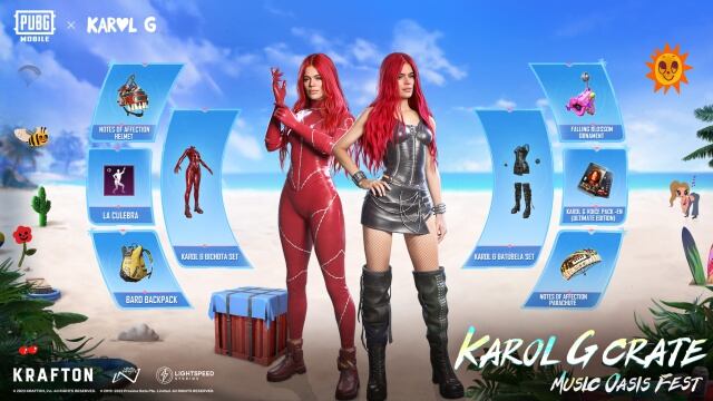 Hasta el 21 de junio, los jugadores podrán recrear el estilo de Karol G con dos vestuarios inspirados en su $trip Love Tour. Estos conjuntos estarán disponibles exclusivamente en PUBG MOBILE y podrán ser adquiridos al obtener la Caja especial relacionada con la cantante oriunda de Medellin, Colombia. A su vez, los jugadores podrán conseguir el Paquete de Voz que incluye comandos de la misma Karol G.