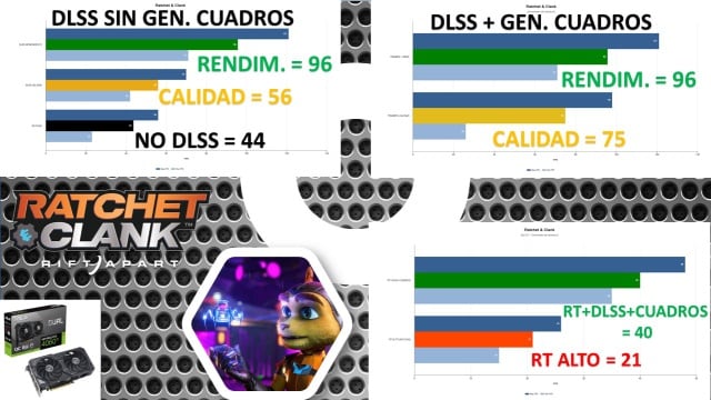 Ratchet and Clank: Primero, probamos el título en estado puro. Sin la ayuda de DLSS, obtuvimos 44 cuadros por segundo con algunas caídas notables. Pero al encender la opción, nuestra experiencia mejoró muchísimo (25% en modo Calidad y más del doble en Rendimiento). Ambos modos mantenían una buena fidelidad gráfica. Después, aplicamos el generador de cuadros y notamos una gran mejora en el modo Calidad (+50%), aunque en rendimiento fue exactamente lo mismo. Aplicando ray tracing en Ultra y sin apoyo de DLSS, la tarjeta no pudo mantener una experiencia estable; cayendo hasta 21 cuadros. Pero con todas las opciones encendidas, logramos trazado de rayos y 40 cuadros por segundo.