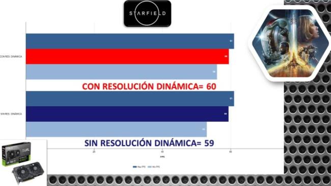 Starfield: Igualmente, pusimos a prueba todas las opciones con el máximo posible. Este título cuenta con otro tipo de tecnología para mejorar el desempeño: resolución dinámica. Sin embargo, nuestras pruebas no encontraron una mejora sustancial usándola. Pero pudimos jugarlo al máximo a 60 cuadros sin problemas.