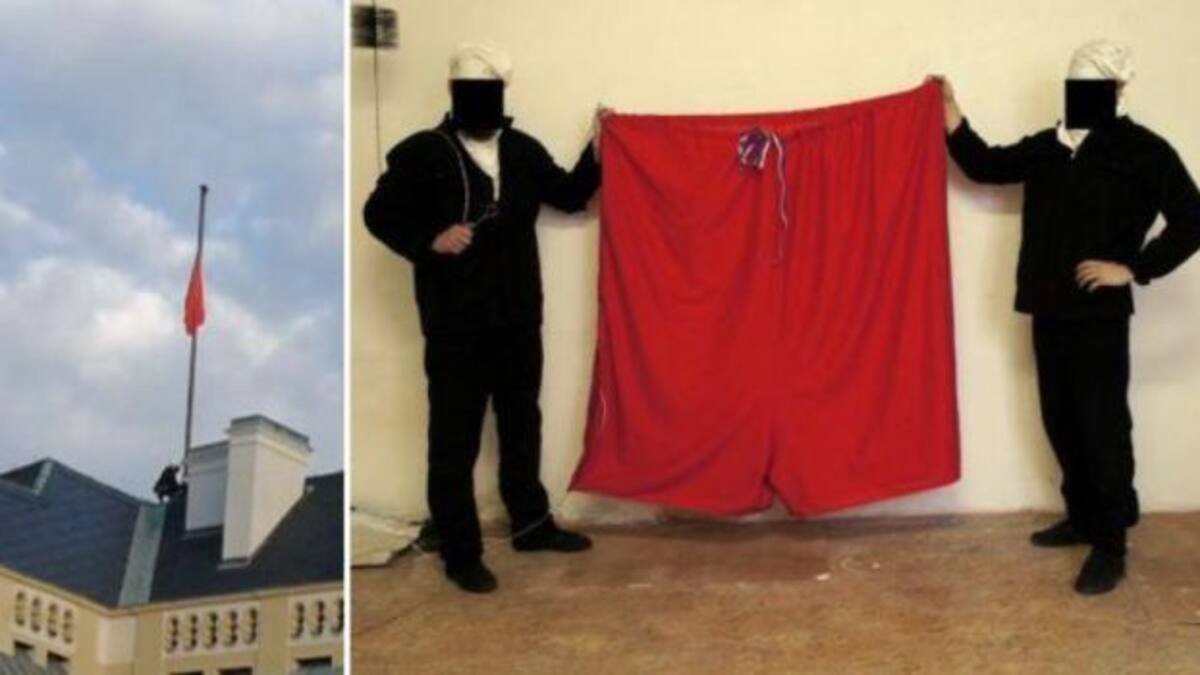 Protestan contra al presidente del país cambiando la bandera presidencial en el Castillo de Praga por un calzón rojo