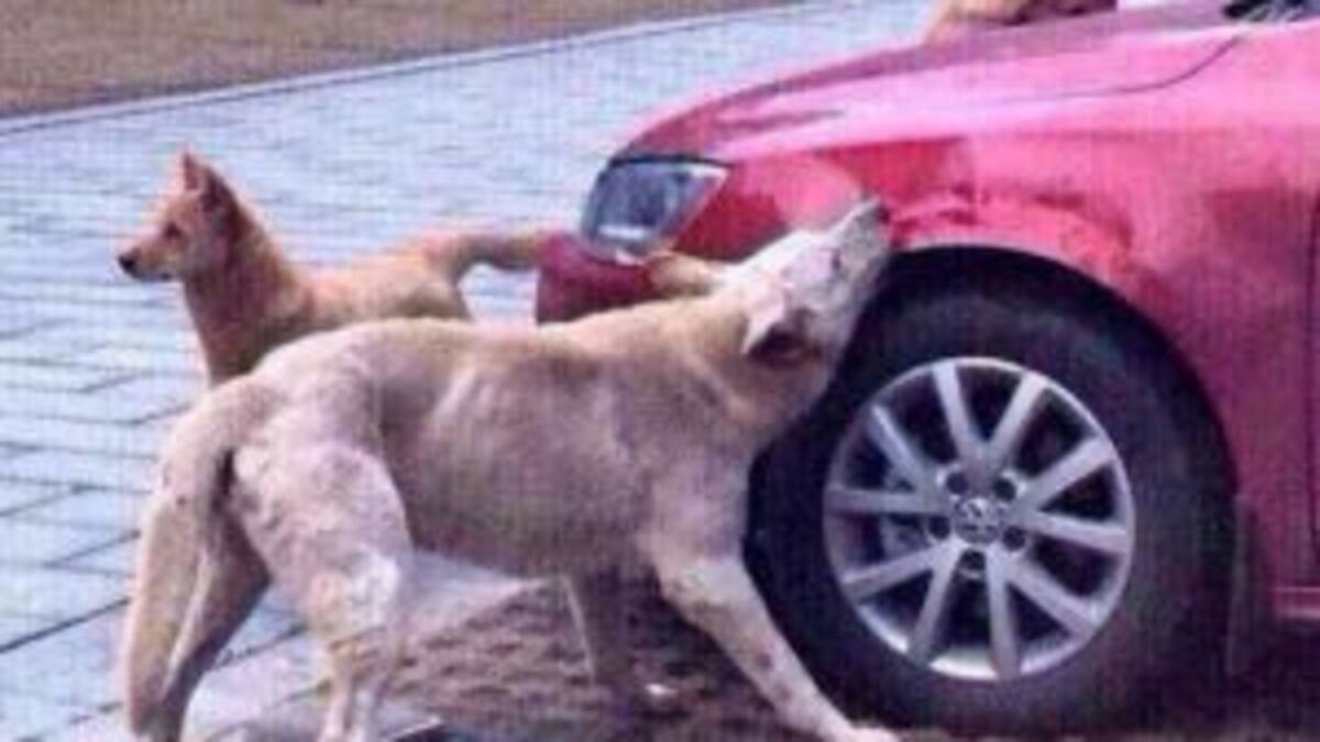 Perro se venga con hombre mordiendo su coche