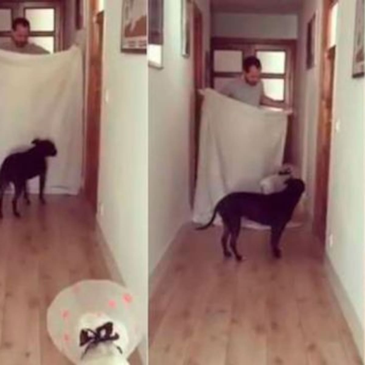 Es troleado por sus perros al intentar hacer el truco viral de la sábana