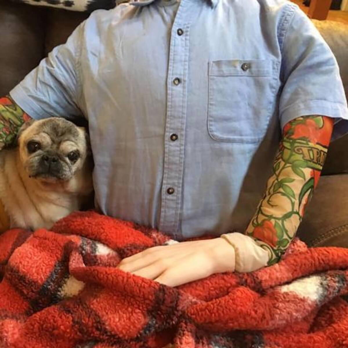 Un maniquí fue disfrazado del dueño de un perro de raza pug para que dejara de estar triste