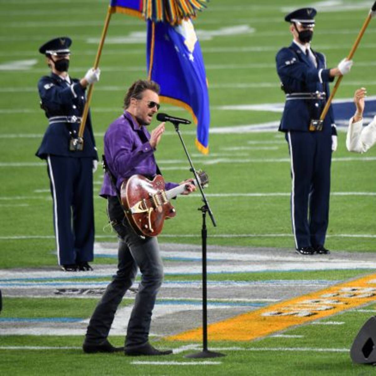 Los artistas nominados al Grammy, Eric Church y Jazmine Sullivan se unieron para cantar el Himno Nacional como parte de las celebraciones de la final de la NFL en el “Raymond James Stadium”