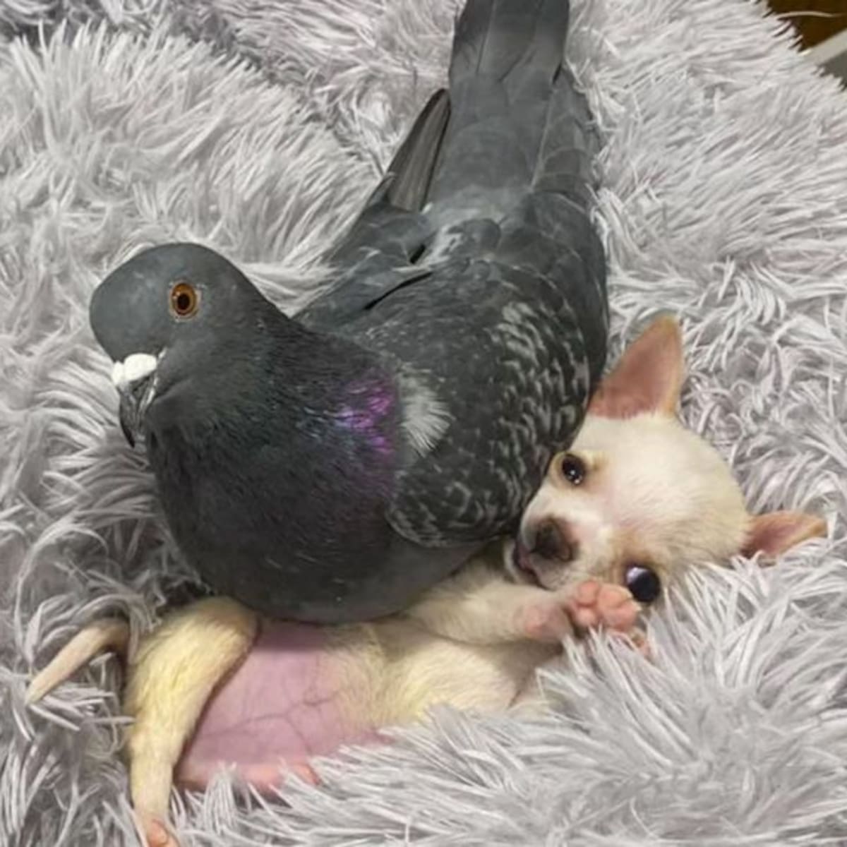 Un perrito chihuahua y una paloma que no puede volar son grandes amigos y estas imágenes que circulan en redes sociales han causado ternura entre los internautas